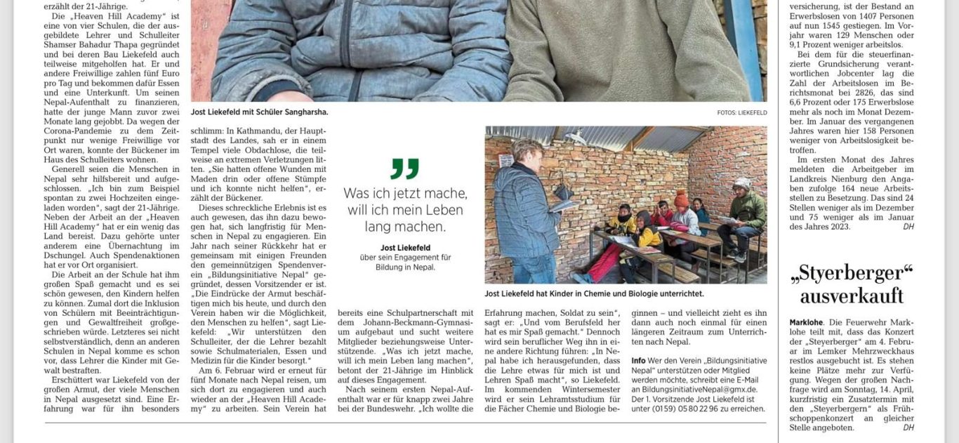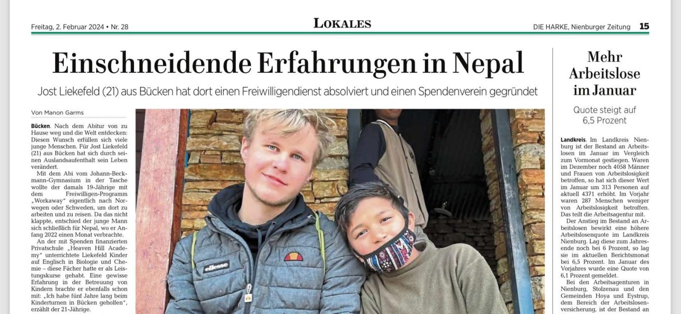 Als ich, Jost Liekefeld mich erneut für einen Freiwilligendienst entschied, wusste ich, dass mich eine intensive Zeit erwarten würde. Dennoch haben die Erlebnisse meine Erwartungen übertroffen. Mein Einsatzort waren vier kostenlose, gewaltfreie Schulen in ländlichen Regionen Nepals, mit dem Schwerpunkt auf der New Marigold-Schule.